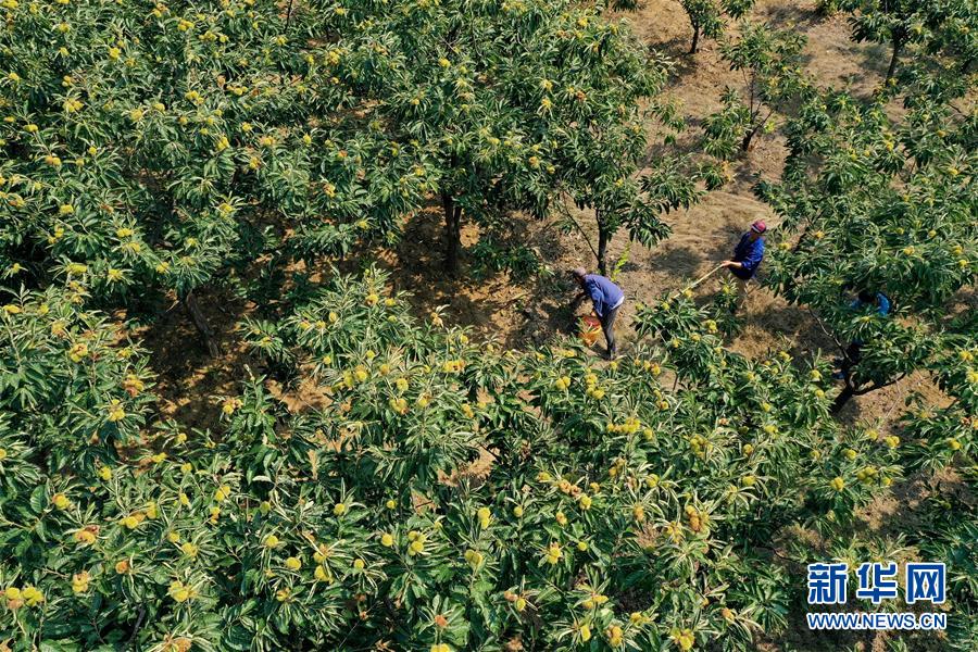 9月6日,河北省遷西縣三屯營鎮(zhèn)彭莊村農(nóng)民在收獲板栗(無人機(jī)照片)。 近日,有著“板栗之鄉(xiāng)”美譽(yù)的河北省遷西縣75萬畝板栗迎來收獲季,當(dāng)?shù)剞r(nóng)民利用晴好天氣收獲板栗。近年來,遷西縣推進(jìn)板栗產(chǎn)業(yè)規(guī)模化、鏈條化發(fā)展,讓板栗成為農(nóng)民增收的重要產(chǎn)業(yè)。 新華社記者 牟宇 攝