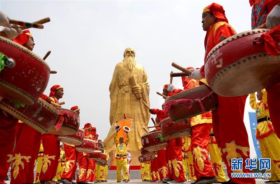 表演團隊在函谷關歷史文化旅游區內的老子像前表演(6月13日攝)。 新華社記者 李安 攝