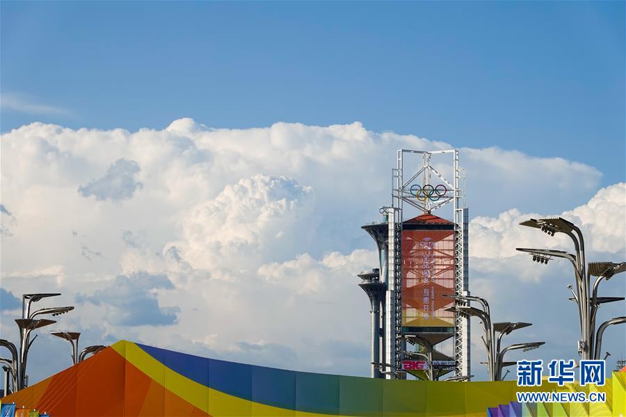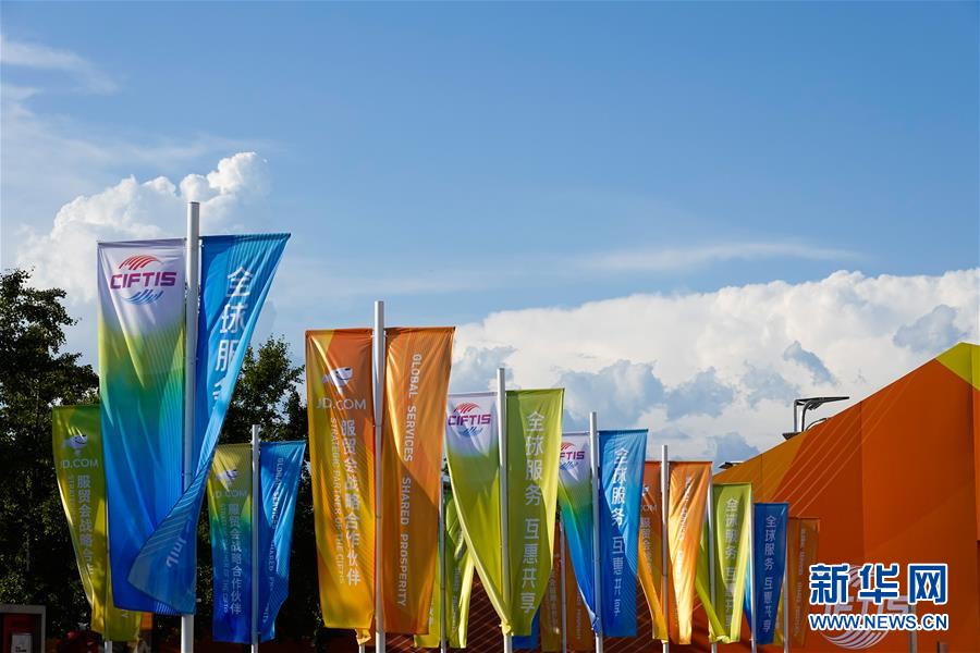 這是9月7日拍攝的服貿會彩旗和專題展區外景。 2020年中國國際服務貿易交易會9月4日至9日在北京舉行。 新華社記者 張笑宇 攝