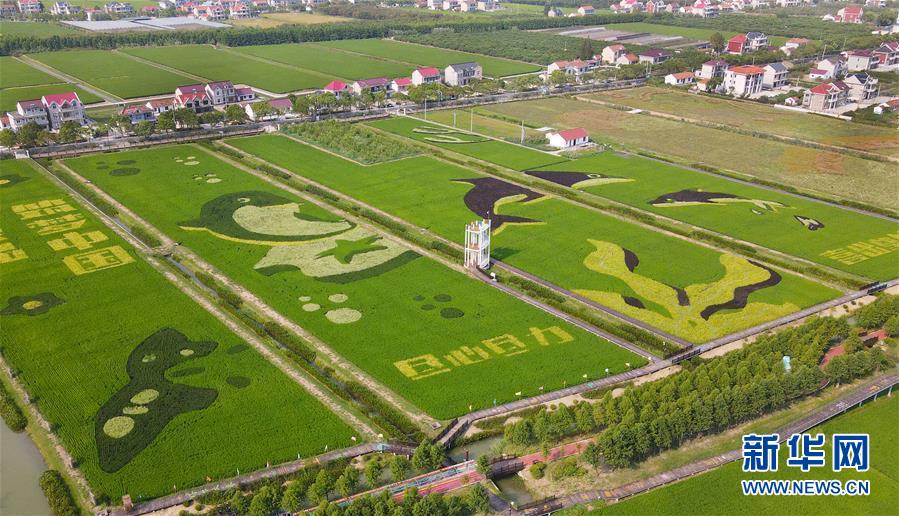 這是上海崇明區橫沙鄉豐樂村的稻田畫(9月8日攝,無人機照片)。 在上海崇明區橫沙鄉豐樂村,一片稻田畫成為當地一道靚麗的風景。稻田中呈現出江豚和將于2021年在崇明舉辦的花博會主題元素圖案,引人注目。 新華社記者 方喆 攝