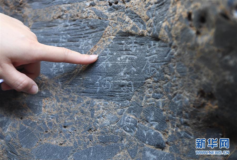 9月8日,圓明園管理處工作人員在介紹太湖石上刻畫的詩句。新華社記者 羅曉光 攝