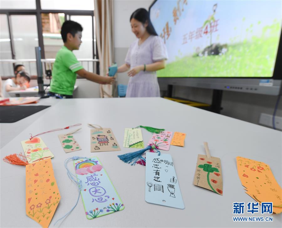 9月9日,在福州市烏山小學(xué),五年級學(xué)生在美術(shù)課上自制感恩主題書簽送給老師。 教師節(jié)前夕,福建省福州市中小學(xué)校紛紛開展尊師重教主題活動,向老師表達感恩之心。 新華社記者 宋為偉 攝
