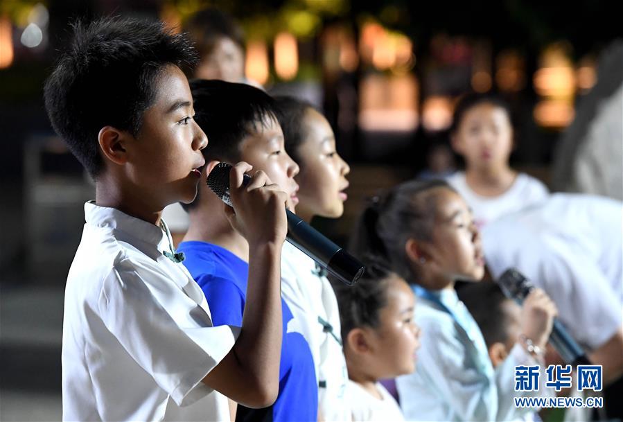 在河南鞏義一處公園內(nèi),孩子們?cè)谠?shī)會(huì)上朗誦詩(shī)歌(6月19日攝)。 新華社記者 李安 攝
