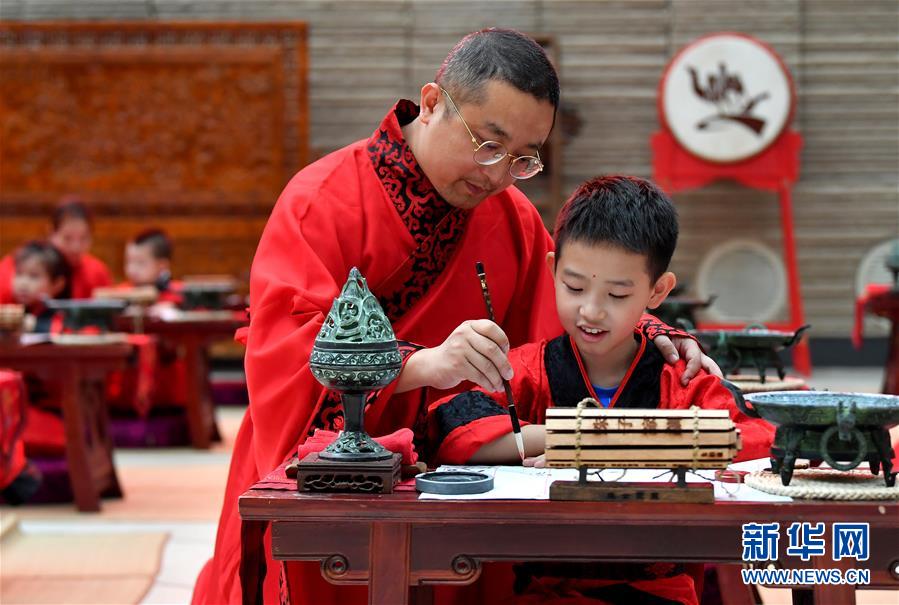 9月13日,家長帶領孩子一起進行“啟蒙描紅”。 當日,一場漢服“開筆禮”在西安大唐西市博物館舉行,多名孩童著漢服,行漢禮,通過“朱砂開智”“啟蒙描紅”等環節體驗中國傳統文化。 新華社記者 劉瀟 攝