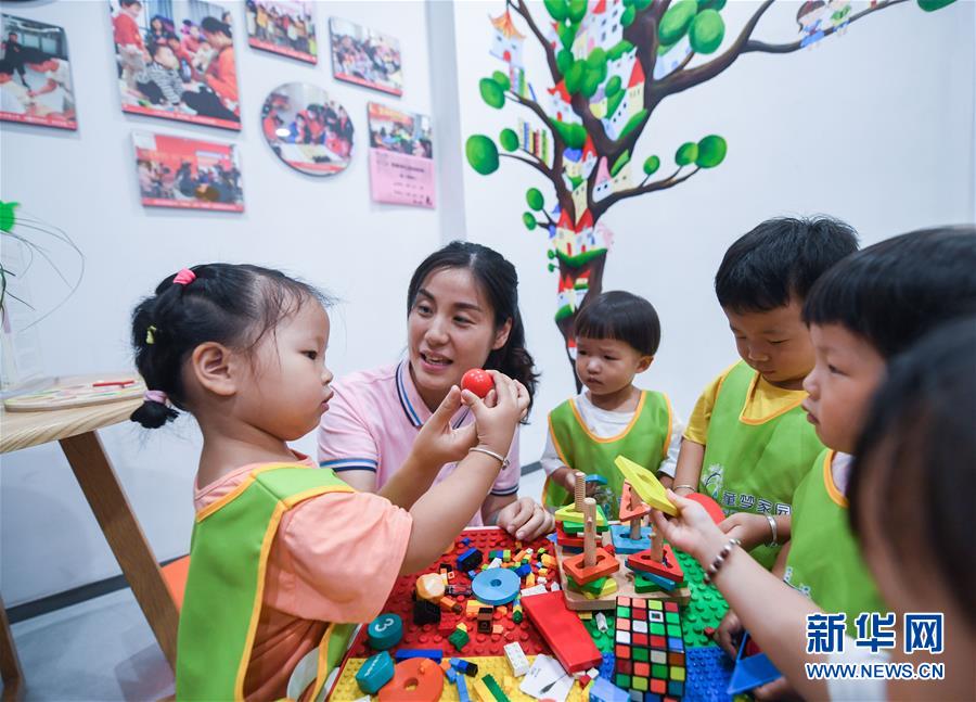 9月15日,龍泉街道市陌河社區公益早教班的老師正在給社區內的幼兒上積木課。 從2019年底開始,浙江省湖州市龍泉街道在下轄社區試點開辦公益早教班,為社區內0-3歲的幼兒開展常態化和免費的早教服務,讓社區幼兒在家門口就能享受到公益早教課程,有效補充了社區幼兒的學前教育空白,進一步打造社區教育服務新模式,解決社區居民的后顧之憂。 新華社記者 徐昱 攝