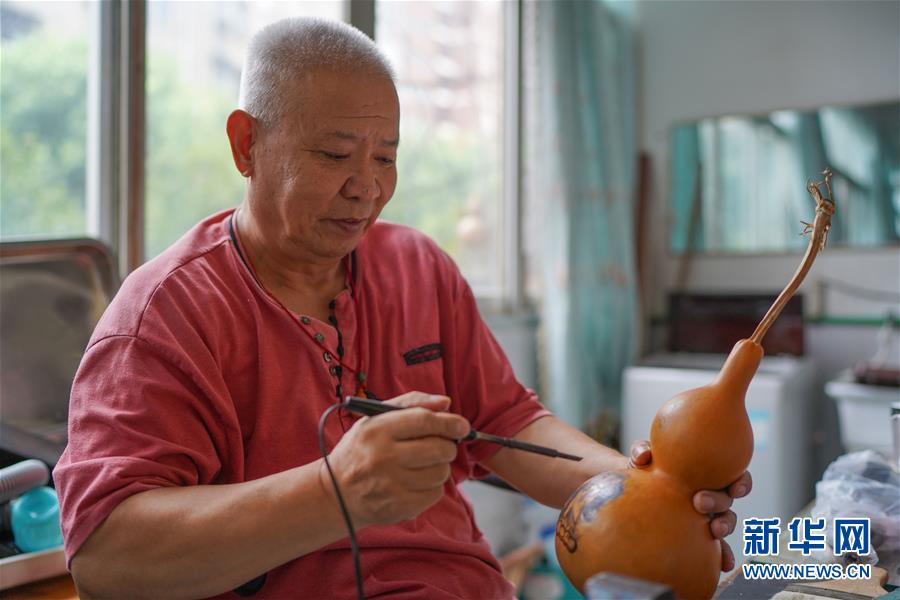 9月16日,劉振在家中進行創作。 71歲的劉振居住在江西省南昌市青山湖區塘山鎮高新社區,因為常年使用葫蘆進行創作,他被人們親切地稱為”葫蘆爺爺“。2004年,劉振在一次意外中脊柱受傷,之后大部分時間不得不待在家里。不甘寂寞的劉振嘗試用烙鐵在葫蘆上進行創作,題材豐富多彩。如今,劉振已經創作了數千個葫蘆,“葫蘆爺爺”用葫蘆創造了一個精彩的世界。 新華社記者 周密 攝