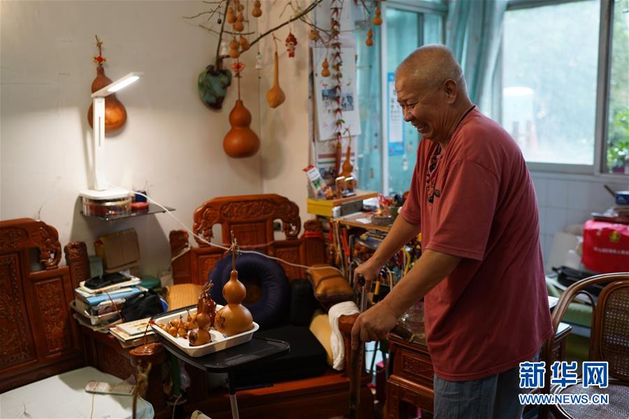 9月16日,劉振拄著拐杖在家中行走。 71歲的劉振居住在江西省南昌市青山湖區(qū)塘山鎮(zhèn)高新社區(qū),因?yàn)槌D晔褂煤J進(jìn)行創(chuàng)作,他被人們親切地稱為”葫蘆爺爺“。2004年,劉振在一次意外中脊柱受傷,之后大部分時(shí)間不得不待在家里。不甘寂寞的劉振嘗試用烙鐵在葫蘆上進(jìn)行創(chuàng)作,題材豐富多彩。如今,劉振已經(jīng)創(chuàng)作了數(shù)千個(gè)葫蘆,“葫蘆爺爺”用葫蘆創(chuàng)造了一個(gè)精彩的世界。 新華社記者 周密 攝