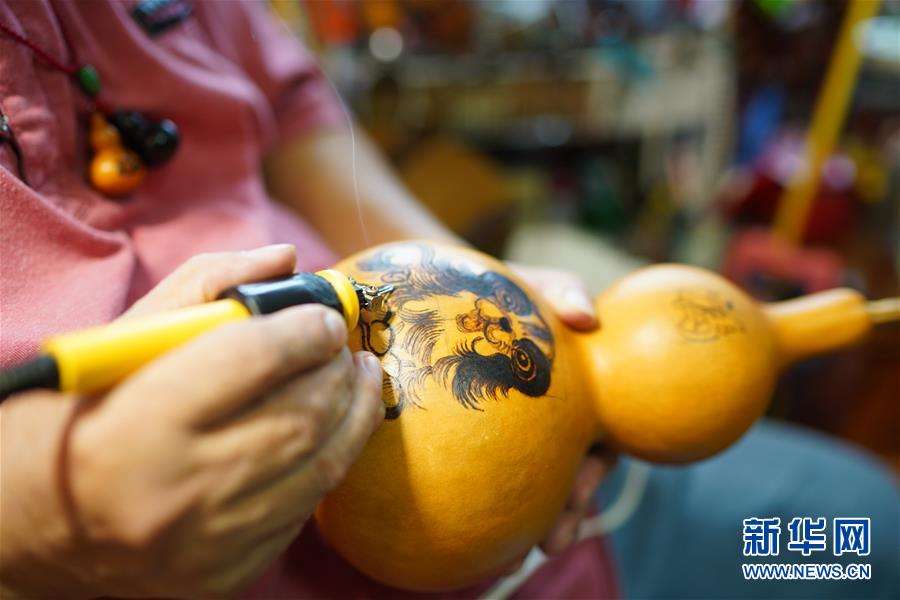 9月16日,劉振在葫蘆上創(chuàng)作。 71歲的劉振居住在江西省南昌市青山湖區(qū)塘山鎮(zhèn)高新社區(qū),因?yàn)槌D晔褂煤J進(jìn)行創(chuàng)作,他被人們親切地稱為”葫蘆爺爺“。2004年,劉振在一次意外中脊柱受傷,之后大部分時(shí)間不得不待在家里。不甘寂寞的劉振嘗試用烙鐵在葫蘆上進(jìn)行創(chuàng)作,題材豐富多彩。如今,劉振已經(jīng)創(chuàng)作了數(shù)千個(gè)葫蘆,“葫蘆爺爺”用葫蘆創(chuàng)造了一個(gè)精彩的世界。 新華社記者 周密 攝
