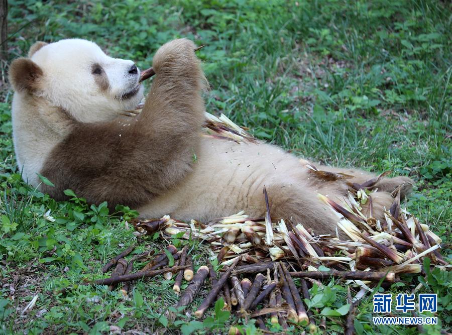 9月17日,“七仔”在位于陜西西安的秦嶺大熊貓研究中心吃竹筍。 生活在陜西西安秦嶺大熊貓研究中心的“七仔”是世界唯一圈養棕色大熊貓。今年11歲的“七仔”因獨特的毛色與憨態可掬的吃相走紅網絡,深受大家喜愛。在工作人員的悉心照料下,目前“七仔”身體狀況良好。 新華社記者 梁娟 攝