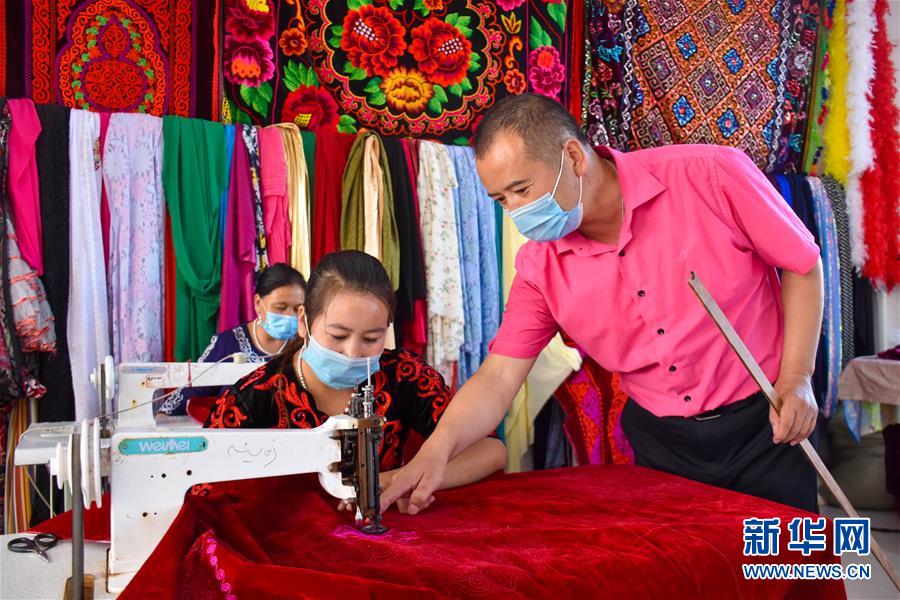 9月20日,在新疆阿克陶縣絲路佳苑手工藝合作社內(nèi),艾拉努爾·吾普爾的丈夫乃再爾·依迪西指導(dǎo)員工縫制繡品。艾拉努爾·吾普爾和丈夫開了一家手工藝合作社,帶動了周邊20戶搬遷居民就業(yè)。 在新疆阿克陶縣絲路佳苑易地扶貧搬遷安置點內(nèi),居住著6000多名從昆侖山深處搬遷下來的居民。近年來,當(dāng)?shù)卣掷m(xù)加強易地搬遷后續(xù)扶持力度,因地制宜發(fā)展包括傳統(tǒng)手工藝制作在內(nèi)的多種產(chǎn)業(yè),讓居民在安置點“搬得下、穩(wěn)得住、能致富”,助推搬遷戶脫貧。 新華社記者 高晗 攝