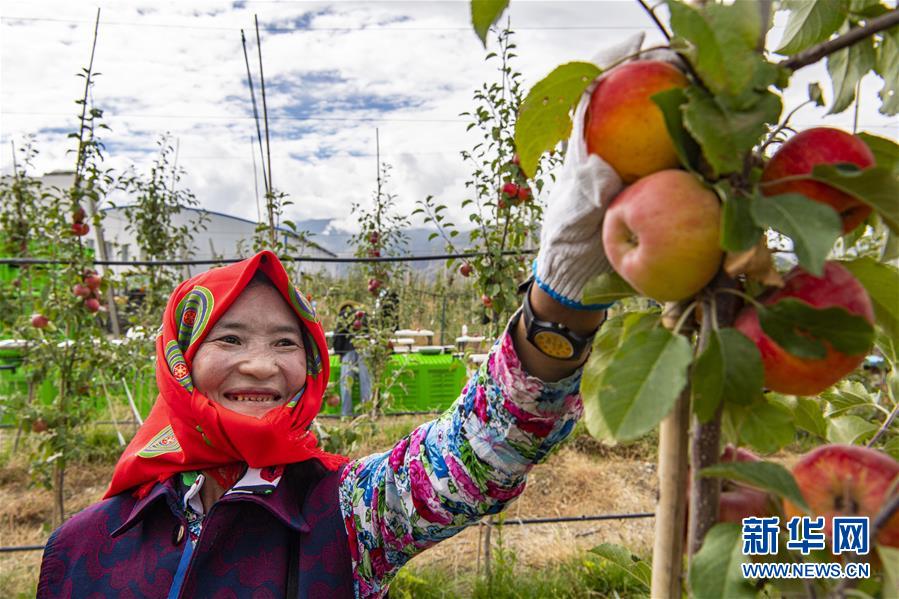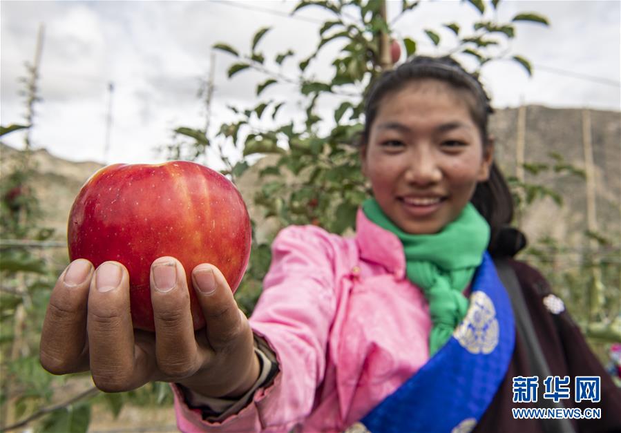 9月23日,一名搬遷群眾在展示剛剛采摘的蘋(píng)果。金秋豐收季,在西藏山南市貢嘎縣森布日村,森布日搬遷安置點(diǎn)附近的千畝矮化蘋(píng)果種植園迎來(lái)豐收。森布日搬遷安置點(diǎn)是西藏極高海拔地區(qū)居民生態(tài)搬遷安置點(diǎn)之一。2018年6月,西藏開(kāi)始實(shí)施極高海拔生態(tài)搬遷項(xiàng)目。2019年底,來(lái)自那曲市安多縣色務(wù)鄉(xiāng),雙湖縣嘎措鄉(xiāng)、雅曲鄉(xiāng)、措折強(qiáng)瑪鄉(xiāng)的共計(jì)957戶(hù)、4058名群眾搬遷至此。 矮化蘋(píng)果種植園是山南市森布日極高海拔生態(tài)搬遷點(diǎn)經(jīng)濟(jì)林種植基地建設(shè)項(xiàng)目的一部分,目前委托給西藏康其農(nóng)業(yè)發(fā)展有限公司管理運(yùn)營(yíng)。果園收入的65%將作為分紅交給搬遷群眾。 新華社記者 孫非 攝