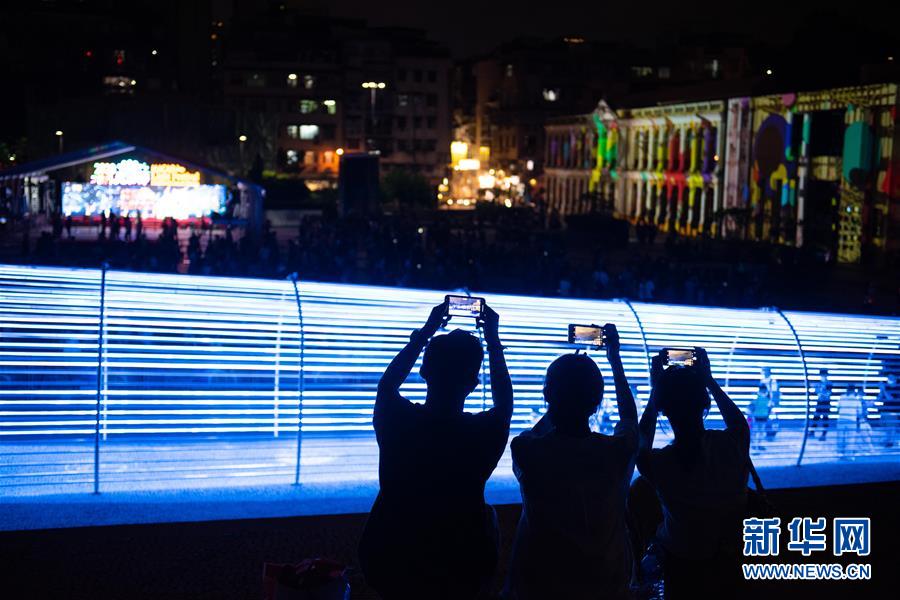 9月26日,人們在澳門光影節上游覽拍攝。 當日,由澳門特區政府旅游局主辦的“2020澳門光影節——光影嘉年華”活動在澳門塔石廣場舉行開幕儀式。今年的澳門光影節將持續到10月31日。 新華社記者 張金加 攝