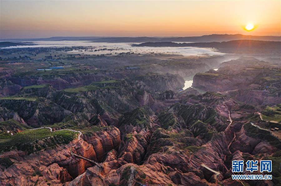 一輪紅日照耀著靖邊縣龍洲鎮波浪谷丹霞景區(9月24日攝,無人機照片)。 陜西省靖邊縣龍洲鎮波浪谷丹霞景區地處陜北黃土高原,地質資源豐富多樣,線谷、巷谷、絕壁等構成了特有的波浪形砂巖地貌,形成了罕見的獨特景觀,是一處集攝影、寫生、探險、研學、旅游于一體的好去處。 新華社記者 陶明 攝