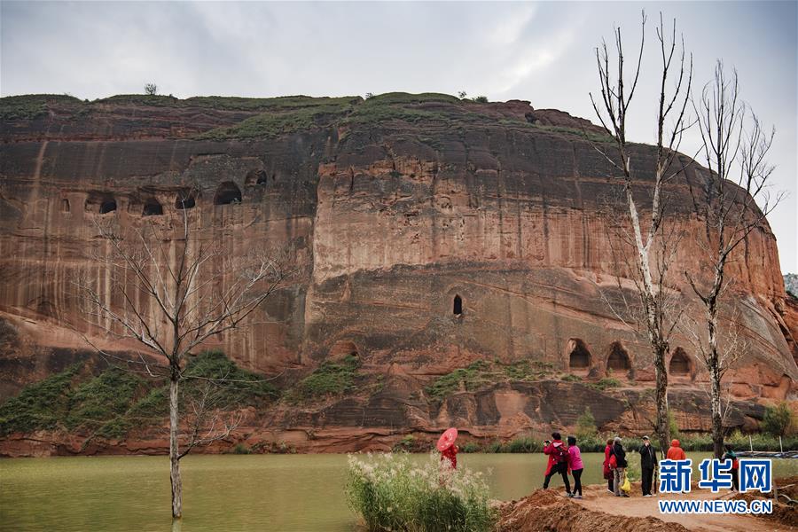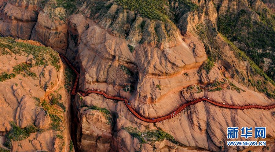游人在靖邊縣龍洲鎮波浪谷丹霞景區游覽(9月26日攝)。 陜西省靖邊縣龍洲鎮波浪谷丹霞景區地處陜北黃土高原,地質資源豐富多樣,線谷、巷谷、絕壁等構成了特有的波浪形砂巖地貌,形成了罕見的獨特景觀,是一處集攝影、寫生、探險、研學、旅游于一體的好去處。 新華社記者 陶明 攝