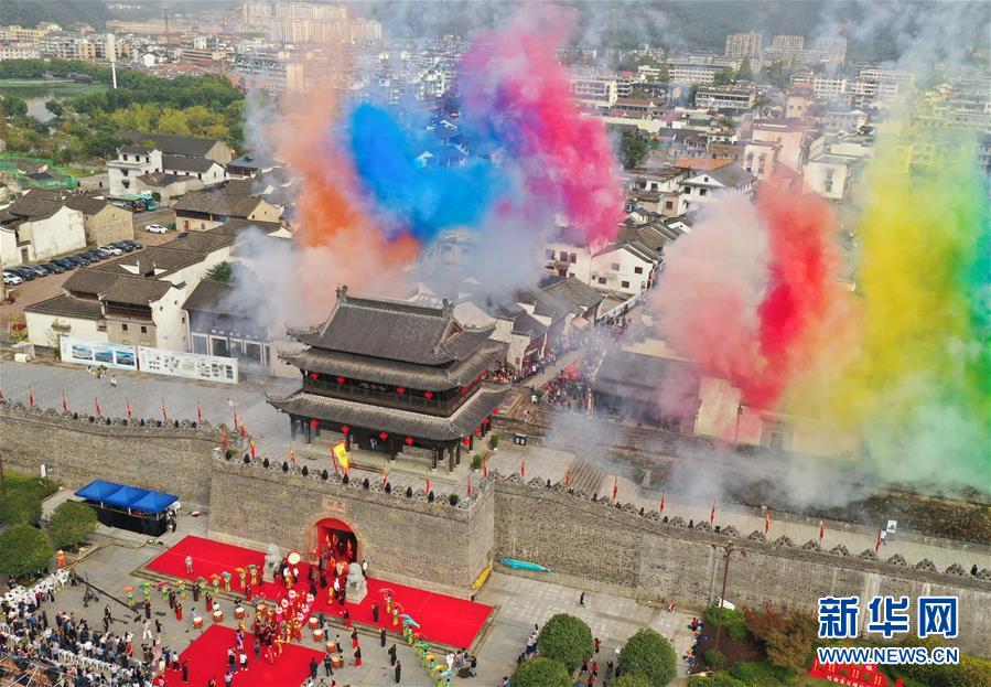 這是9月30日拍攝的嚴州古城開城儀式(無人機照片)。 當日,經過兩年多的修繕,浙江建德有千年歷史的嚴州古城正式開城,重現芳華。 新華社記者翁忻旸攝