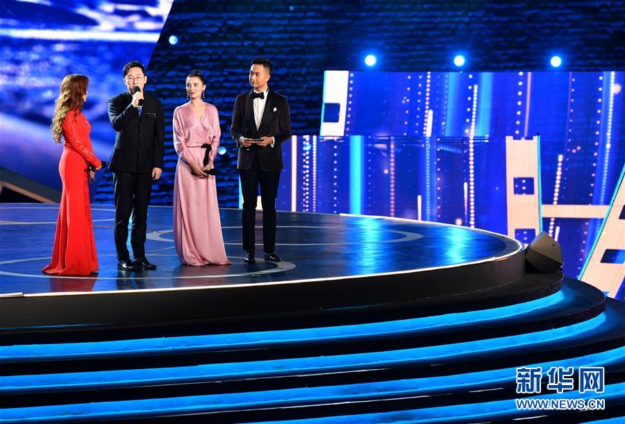 10月11日,電影導演陸川(左二)在第七屆絲綢之路國際電影節開幕式上致辭。 當日,第七屆絲綢之路國際電影節在陜西西安開幕。本屆電影節以“絲路連接世界、電影和合文明”為主題,設置了影片特別推薦、電影展映、電影論壇等多項活動。 新華社記者 張博文 攝