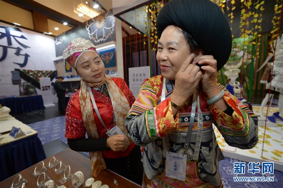 10月18日,在“中國丹寨非遺周”非遺展示館,一名婦女在選購苗族銀飾。 10月18日,首屆“中國丹寨非遺周”在貴州省黔東南苗族侗族自治州丹寨縣萬達小鎮開幕。非遺主題活動將在一周時間內,通過論壇、展示、演出、文創大賽等活動,為當地群眾和游客展現豐富多彩的非遺盛宴。 新華社記者 楊楹 攝