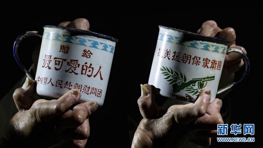 在四川省成都市,志愿軍老戰(zhàn)士涂伯毅展示中國人民赴朝慰問團(tuán)贈送給他的搪瓷水杯(9月28日攝,拼版照片)。 涂伯毅,1931年生,重慶云陽人,1950年隨部隊(duì)入朝。涂伯毅經(jīng)歷了抗美援朝戰(zhàn)爭第一、二、三、四次戰(zhàn)役,1951年2月,遭敵人凝固汽油彈襲擊,全身大面積燒傷,致一級傷殘。負(fù)傷后的涂伯毅身殘志堅(jiān),保持積極樂觀的生活態(tài)度,義務(wù)為公眾進(jìn)行愛國主義教育。 新華社記者 沈伯韓 攝