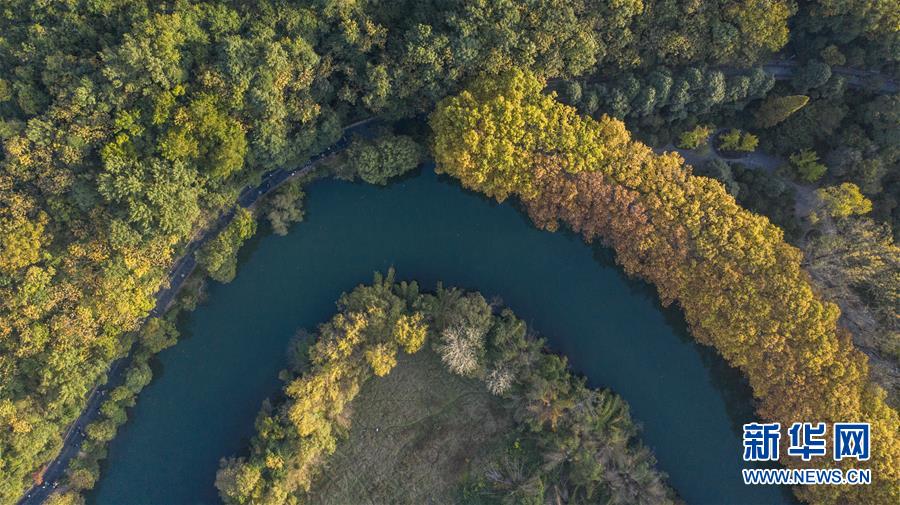 這是貴陽市花溪國家城市濕地公園黃金大道風景(10月24日攝,無人機照片)。 深秋時分,貴州省貴陽市花溪國家城市濕地公園黃金大道秋意盎然,吸引眾多游客前來觀賞游玩。 新華社記者 陶亮 攝