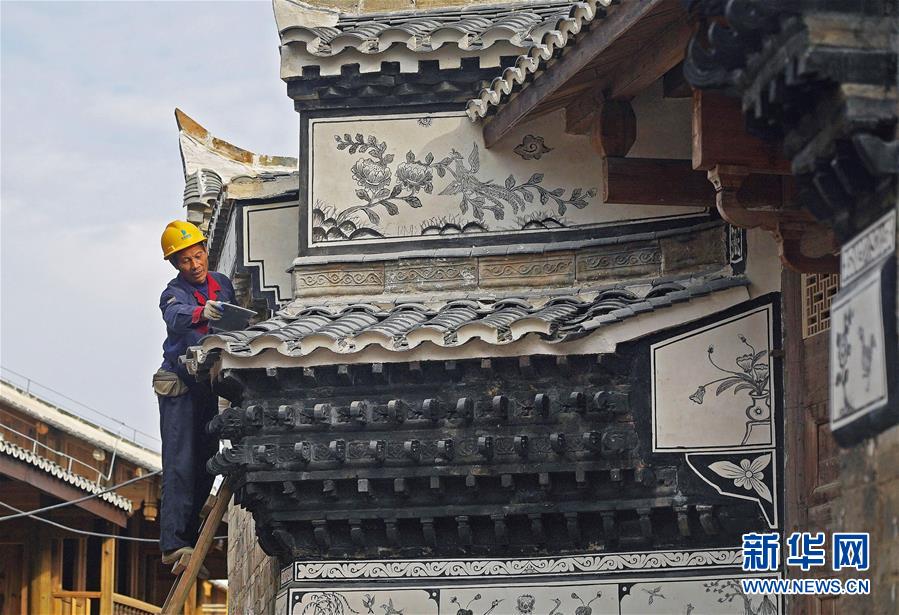 在位于江西省靖安縣縣城的西門古街,施工人員對一處古民居進行修繕(11月4日攝)。 江西省靖安縣歷史悠久,境內擁有古建筑近300棟。近年來,當地政府在改善居民生活條件、提升城鄉旅游形象的同時,啟動古建筑修繕保護工程,對西門古街、雷家古村等處近100棟古建筑進行全面修繕。 新華社記者 萬象 攝