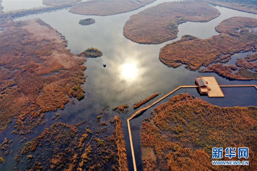 11月5日拍攝的白洋淀風光(無人機照片)。 深秋時節,“華北明珠”白洋淀水面如鏡,蘆葦金黃。近年來,通過有效治理,白洋淀水生態環境持續改善。 新華社記者 牟宇 攝