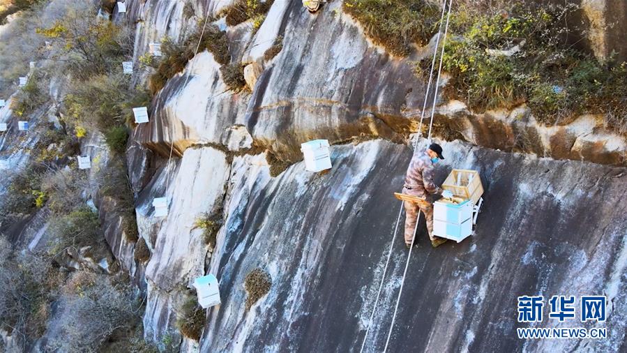 10月17日,北京密云區(qū)馮家峪鎮(zhèn)蜂農(nóng)在崖壁上采集蜂蜜(無人機(jī)照片)。 新華社記者 夏子麟 攝