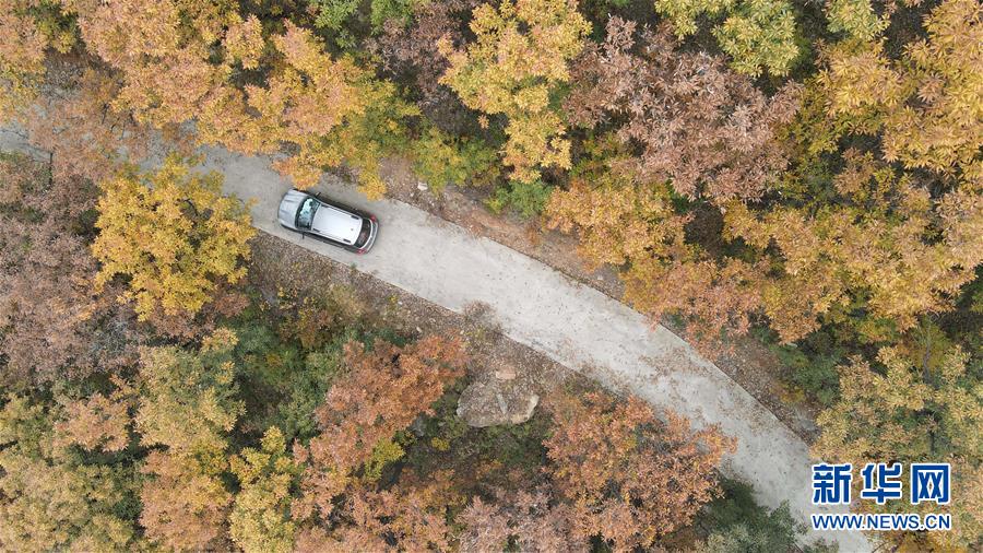 11月5日,一輛車在河北省邢臺市信都區漿水鎮前禪房村山間道路上行駛(無人機照片)。 河北省邢臺市信都區漿水鎮前禪房村位于太行山東麓。深秋時節,樹葉五彩繽紛,梯田層層疊疊,山路彎彎曲曲,太行山區宛然成了一幅色彩斑斕的畫卷。 新華社記者 駱學峰 攝