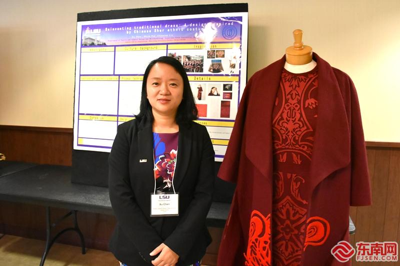 其實早在2019年,陳栩就已經將畬族服飾帶到了國際舞臺上。當時陳栩在美國路易斯安那州立大學做訪問學者,期間恰逢一年一度的國際紡織服裝學會ITAA設計展在美國舉行,陳栩帶著學生們創作的“畬族鳳凰裝”經過國際學術界的雙盲評選,成功入選設計展。“紅色和酒紅色的大膽組合,有趣的圖案,讓作品給人美感和愉悅感,文化元素以創造性的方式清晰地表現出來。”這是國際紡織服裝學會主席金永慶(Youn Kyung Kim)對“畬族鳳凰裝”作品做出的高度評價。此外,陳栩還帶著福建少數民族文化正式登上國際學術殿堂,在美國路易斯安那州立大學第六屆國際學術周上,進行了一場精彩的解說。憑借著多年對福建畬族服飾文化的潛心研究,其現場講解內容不僅讓來自世界各地的師生留下了深刻印象,也讓陳栩榮獲了訪問學者一等獎。