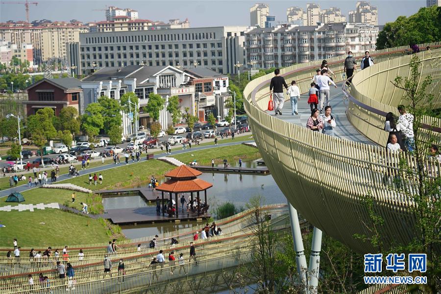 市民在南昌市灣里區(qū)磨盤山森林公園空中步道——“樂道”上游玩(4月9日攝)。新華社記者 周密 攝