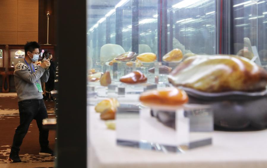 11月11日,觀眾在拍攝展出的玉石作品。當日,中國·蘇州第十二屆玉石文化節暨第十屆中國玉石雕刻“陸子岡杯”玉石精品展在江蘇省蘇州市開幕,來自全國各地的1586件玉石作品集中亮相。新華社記者楊磊攝