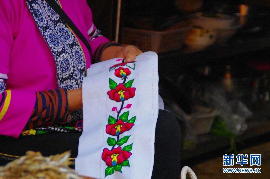 云南省文山壯族苗族自治州丘北縣仙人洞村彝族婦女在刺繡(10月22日攝)。新華社記者 孟佳 攝