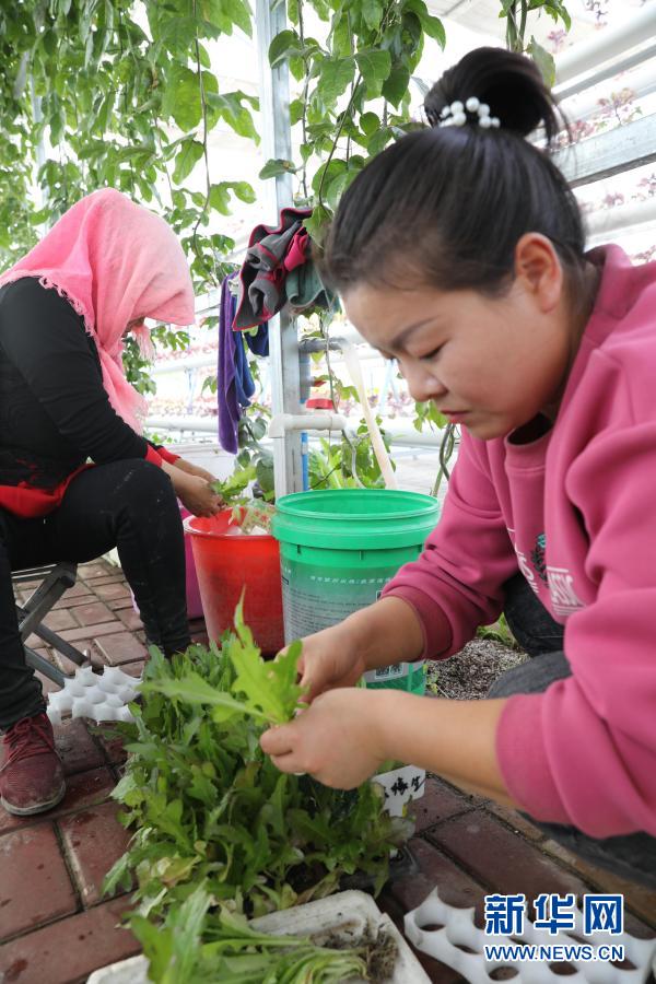 11月15日,工作人員在民勤縣紅旗谷現(xiàn)代農(nóng)業(yè)產(chǎn)業(yè)園內(nèi)勞作。近年來,甘肅省武威市民勤縣利用當?shù)毓庹兆愕奶攸c,大力發(fā)展溫室果蔬種植,帶動當?shù)厝罕娫鍪罩赂弧P氯A社記者 杜哲宇 攝