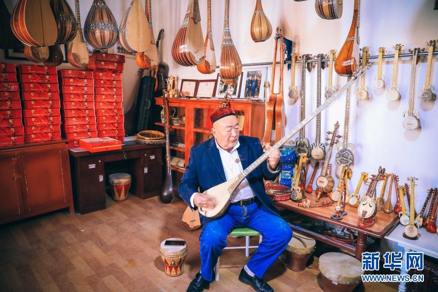 艾依提·依明在家中樂器陳列室演奏民族樂器(11月12日攝)。新華社記者 張曼 攝