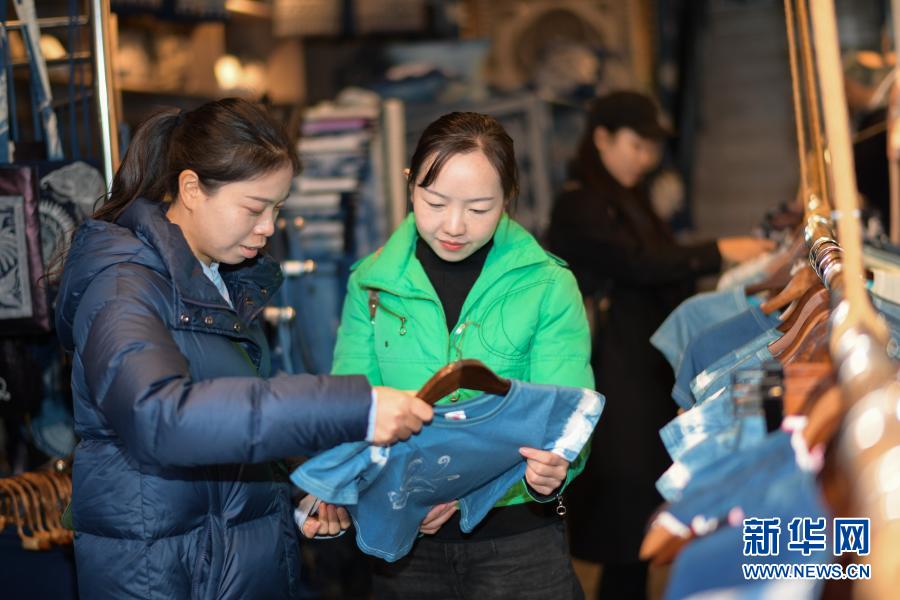 12月1日,在丹寨縣萬達小鎮歐報浪蠟染體驗館,游客在選購蠟染服裝。