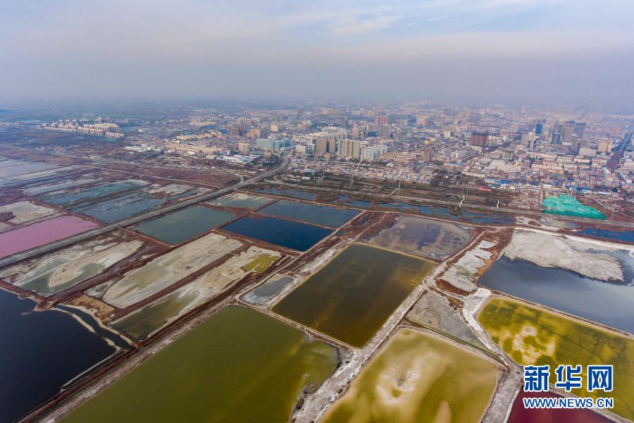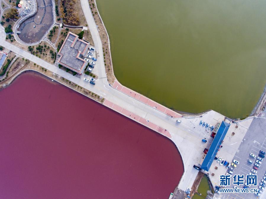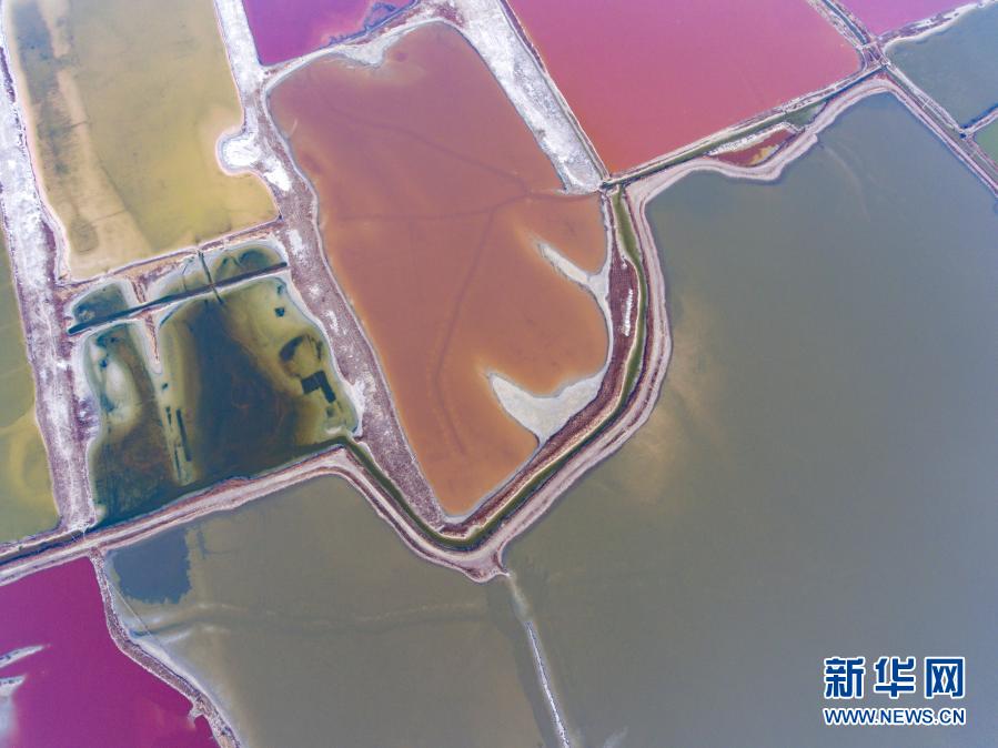 冬日里,從空中俯瞰山西運(yùn)城鹽湖,色彩斑斕,風(fēng)景如畫。新華社記者 楊晨光攝