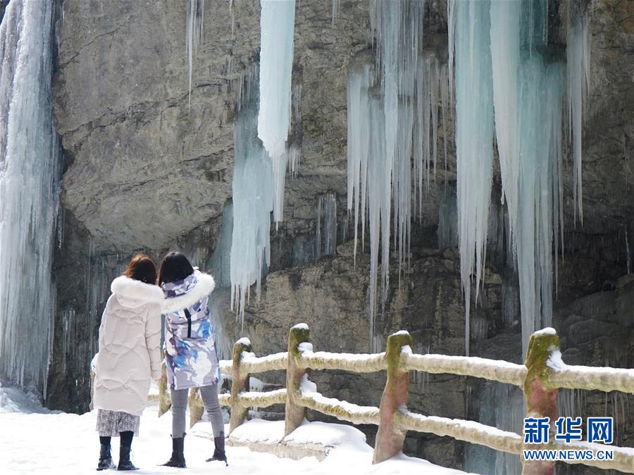12月16日,游客在官鵝溝一處冰瀑前拍照。 連日來,持續低溫讓位于甘肅省隴南市宕昌縣境內的官鵝溝國家森林公園銀裝素裹,景區內群山湖泊被冰雪覆蓋,一道道冰瀑高掛懸崖,宛若一幅美麗畫卷。 新華社記者 郎兵兵 攝