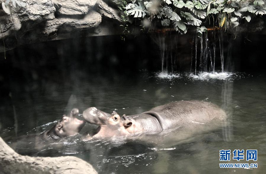 12月20日,河馬“津津”和它的孩子在恒溫水池內嬉戲。