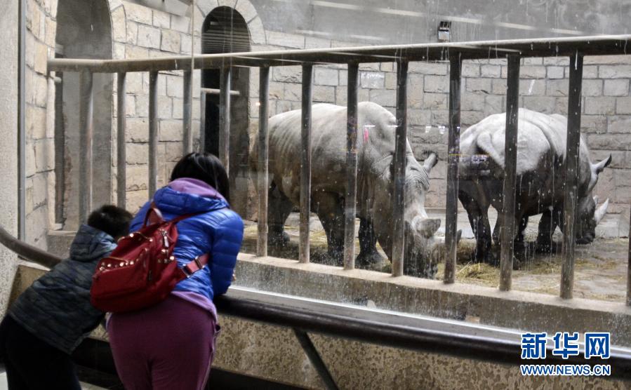12月20日,游人在觀看居住在保溫室內的犀牛。