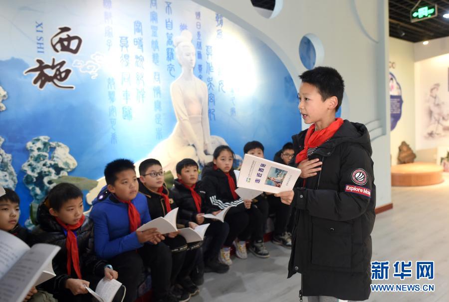 12月22日,浣紗小學五年級學生樓治罕(前)在西施故事傳講社團活動中為同學講述“西施傳說”。