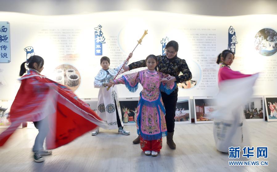 12月22日,浣紗小學戲曲社團學生在俞可芹老師(右二)指導下排練根據“西施傳說”創編的戲曲節目。