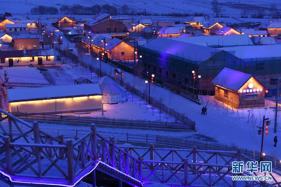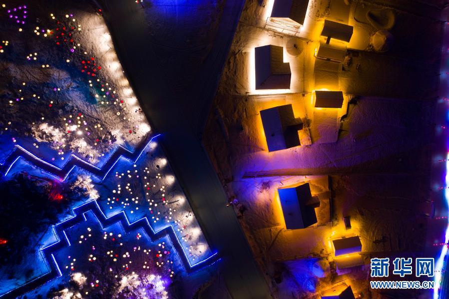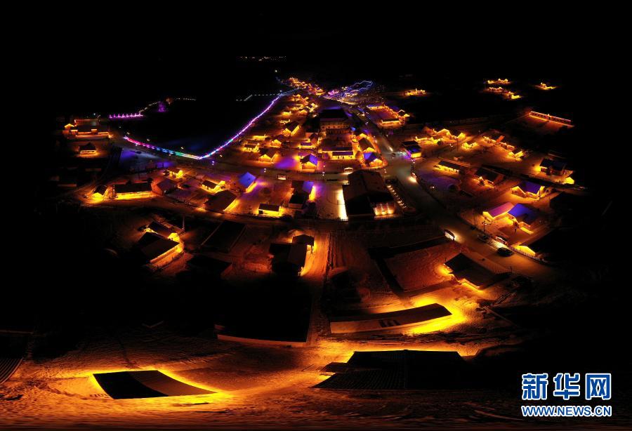 這是12月25日拍攝的塔拉特村景色。新疆阿勒泰地區富蘊縣可可托海鎮塔拉特村位于額爾齊斯河源頭附近,被譽為“額河第一村”。冬季夜幕中的塔拉特村,在燈光的映襯下如同冰雪童話世界。新華社記者 沙達提 攝