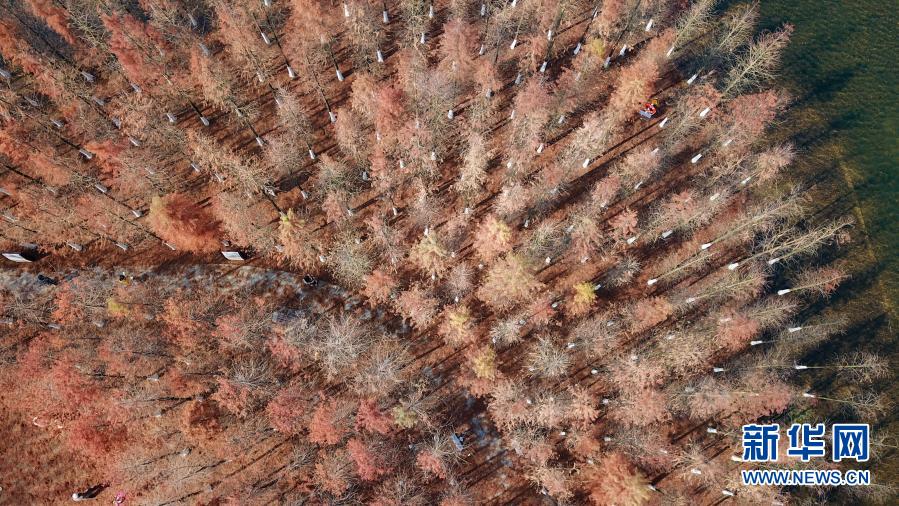 近期,位于湖南省長沙市長沙縣的湖南松雅湖國家濕地公園的水杉樹葉變色,將公園裝扮成一幅美麗畫卷,吸引市民前往觀賞。