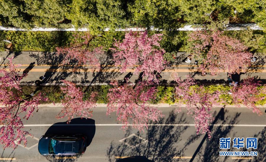 這是1月3日在昆明市紅塔西路拍攝的冬櫻花(無人機照片)。