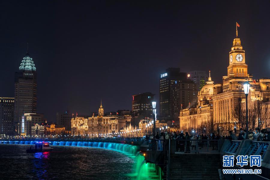 2021年1月2日,人們?cè)谏虾M鉃┬蕾p光影秀。新華社記者 王翔 攝