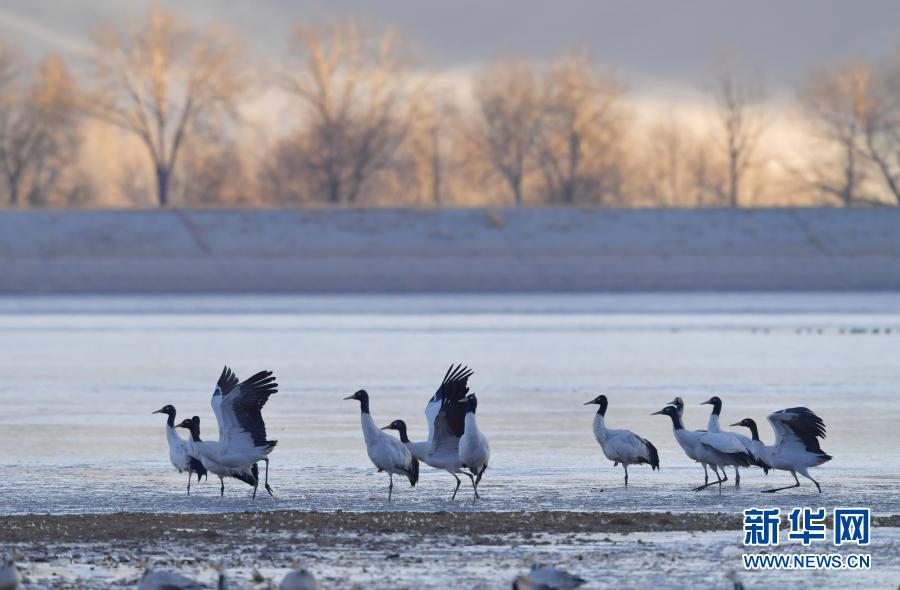 在西藏拉薩市林周縣卡孜水庫棲息的黑頸鶴(2021年1月3日攝)。