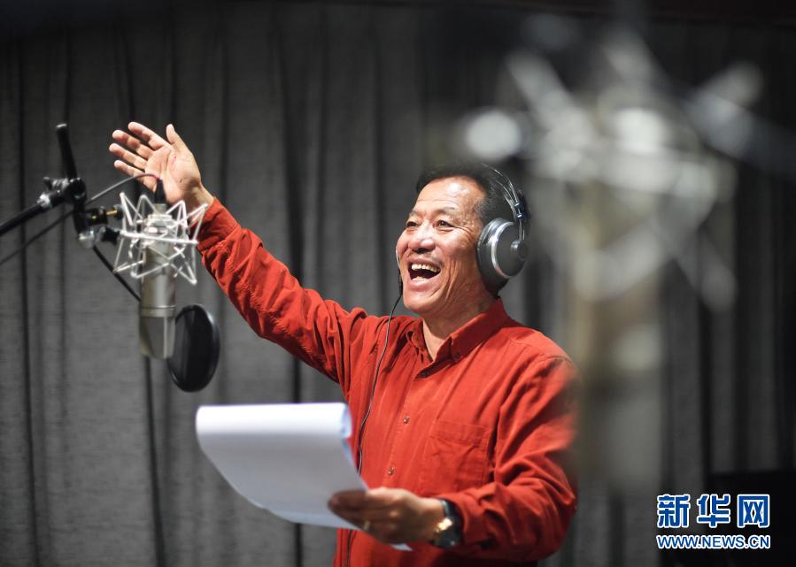 在中國西藏廣播電影電視藏語節(jié)目譯制中心,配音演員倫珠巴桑給藏語節(jié)目配音(2019年3月6日攝)。新華社記者 普布扎西 攝