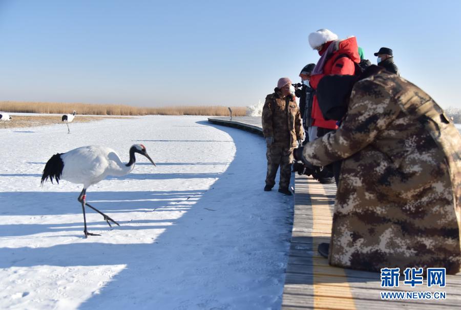 1月11日,丹頂鶴吸引游人駐足觀看。