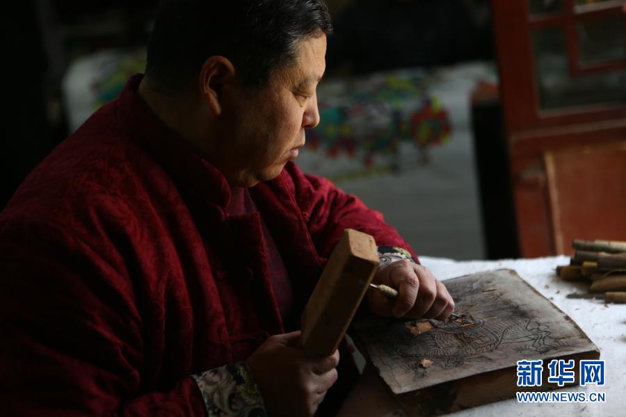 1月19日,開封市朱仙鎮(zhèn)的年畫藝人在進(jìn)行木版雕刻。