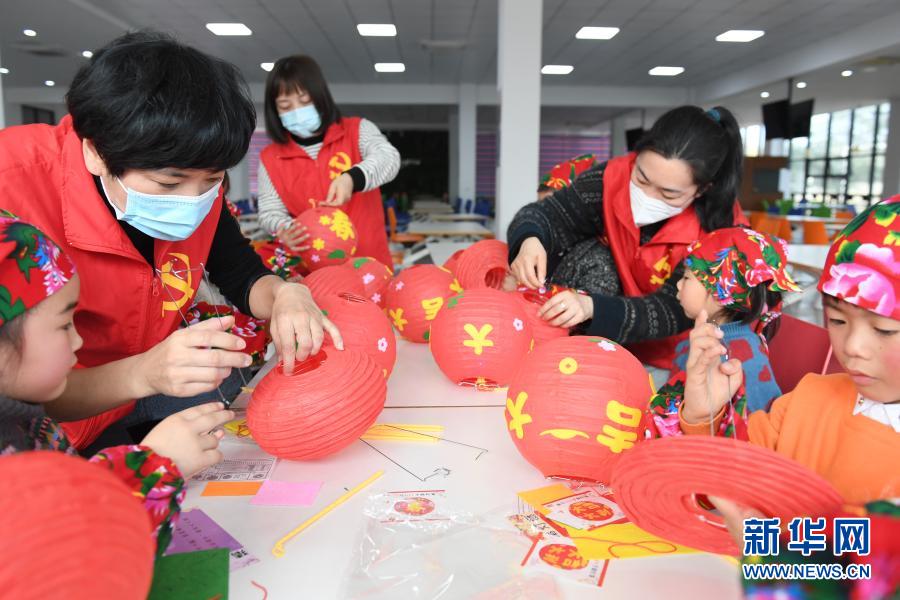 1月21日,埭溪鎮成人文化技術學校的黨員志愿者在一家企業和外來務工人員子女做紅燈籠。