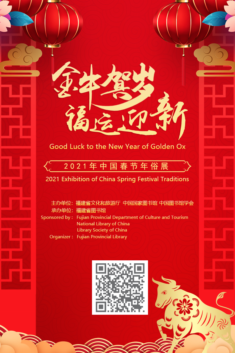 東南網2月9日訊(本網記者 王文青)在中國農歷春節來臨之際,由福建省文化和旅游廳、中國國家圖書館、中國圖書館學會聯合主辦,福建省圖書館承辦的“金牛賀歲 福運迎新”2021年中國春節年俗展(“云展覽”)于2月9日正式上線。年俗展展出時間持續一個月,廣邀海外華僑華人及外國友人“云上觀展”,一起話年俗、憶年味、解鄉愁。
